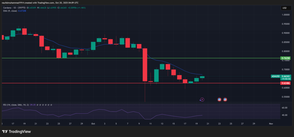 Harga ADA berada di $0.66, dengan batas bawah $0.62 dan batas atas $0.76. Berdasarkan info on-chain dari Santiment, rasio MVRV ADA berada di kisaran -9% hingga -19%, menandakan banyak penanammodal berada dalam posisi rugi belum terealisasi, kondisi nan sering menjadi titik akumulasi jangka menengah.