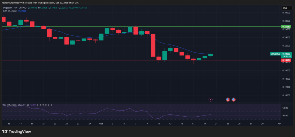 Saat ini DOGE diperdagangkan di $0.20, dengan batas bawah $0.18 dan batas atas $0.26. Jika nilai menembus $0.22 dan bisa memperkuat di atasnya, potensi penguatan ke kisaran $0.26 hingga $0.28 semakin besar.
