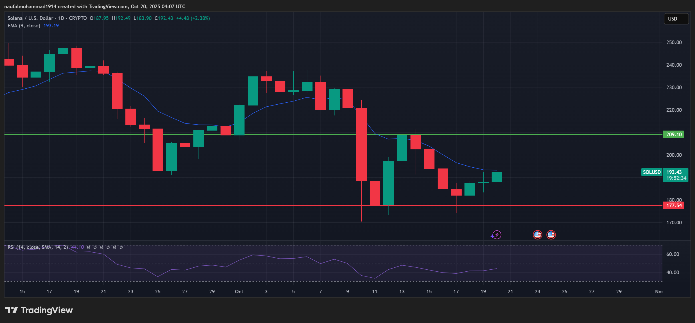 Harga SOL berada di $192, dengan batas bawah $177 dan batas atas $209. Secara teknikal, Solana mempertahankan tren naik selama nilai memperkuat di atas $180. Jika nilai bisa menembus $209, potensi kenaikan ke $225 terbuka lebar.