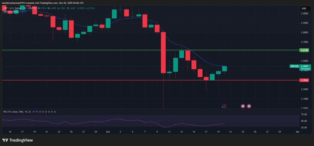 Saat ini, nilai XRP berada di $2.44, dengan batas bawah $2.29 dan batas atas $2.61. Selama nilai memperkuat di atas $2.30, tren tetap condong positif.