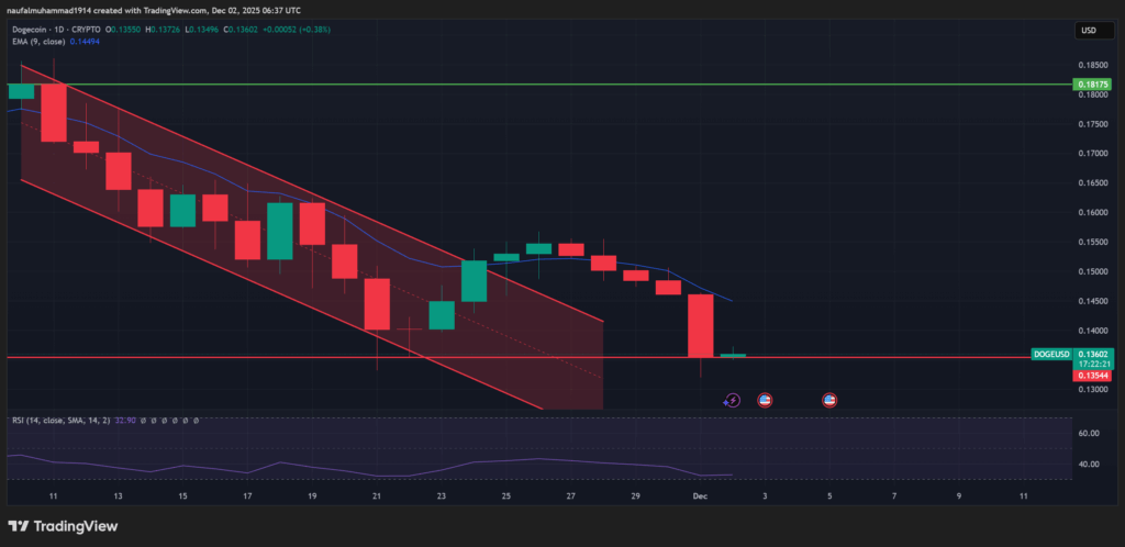 Dogecoin menghadapi tekanan paling signifikan di antara lima aset besar pekan ini. Koreksi nilai membawa DOGE kembali di bawah wilayah nilai $0.14 dan memicu kekhawatiran baru tentang keberlanjutan pergerakan jangka menengahnya.