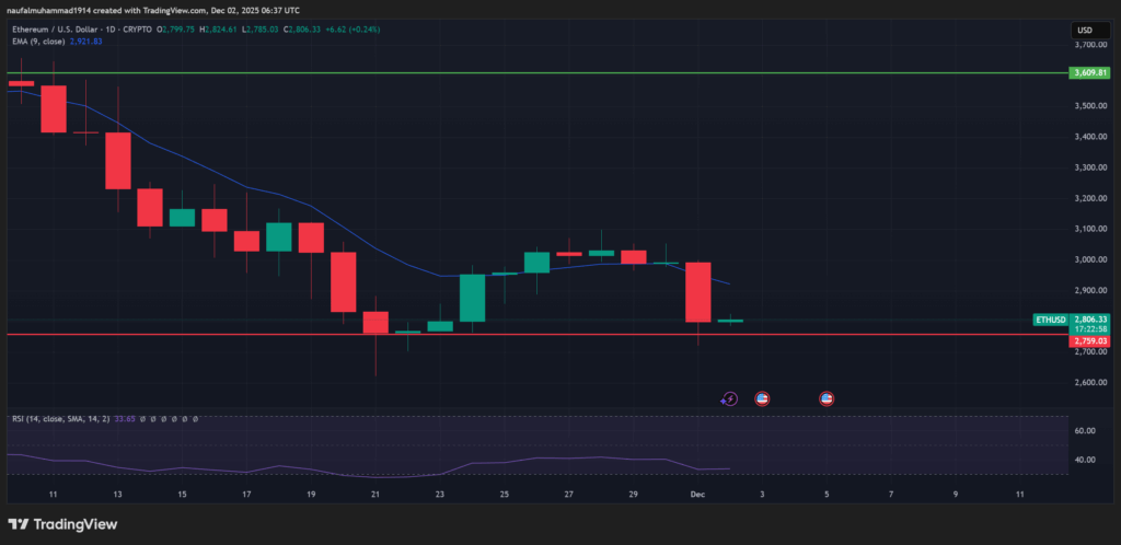 Ethereum kembali mengalami koreksi nilai signifikan hingga turun ke wilayah nilai sekitar $2,800. Pergerakan ini menghapus seluruh apresiasi nilai nan sempat terbentuk pada akhir November.