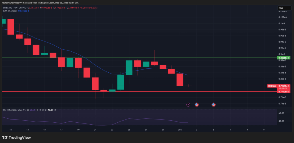 Shiba Inu kembali memasuki fase pelemahan setelah mencoba melakukan rebound akhir November.