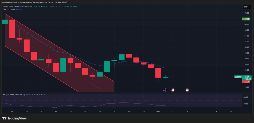 Dari sisi teknikal, tantangan SOL cukup berat. Harga tetap bergerak di bawah moving average mingguan utama, dan wilayah nilai $140 menjadi pemisah krusial nan belum sukses ditembus kembali.