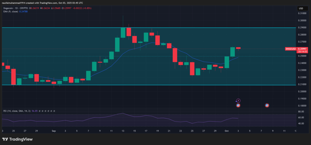 Dogecoin mengawali Oktober dengan apresiasi signifikan hingga $0.256, naik 9% dalam 24 jam terakhir. Pemulihan ini dipicu oleh akumulasi institusional serta spekulasi seputar persetujuan ETF mata uang digital di AS.
