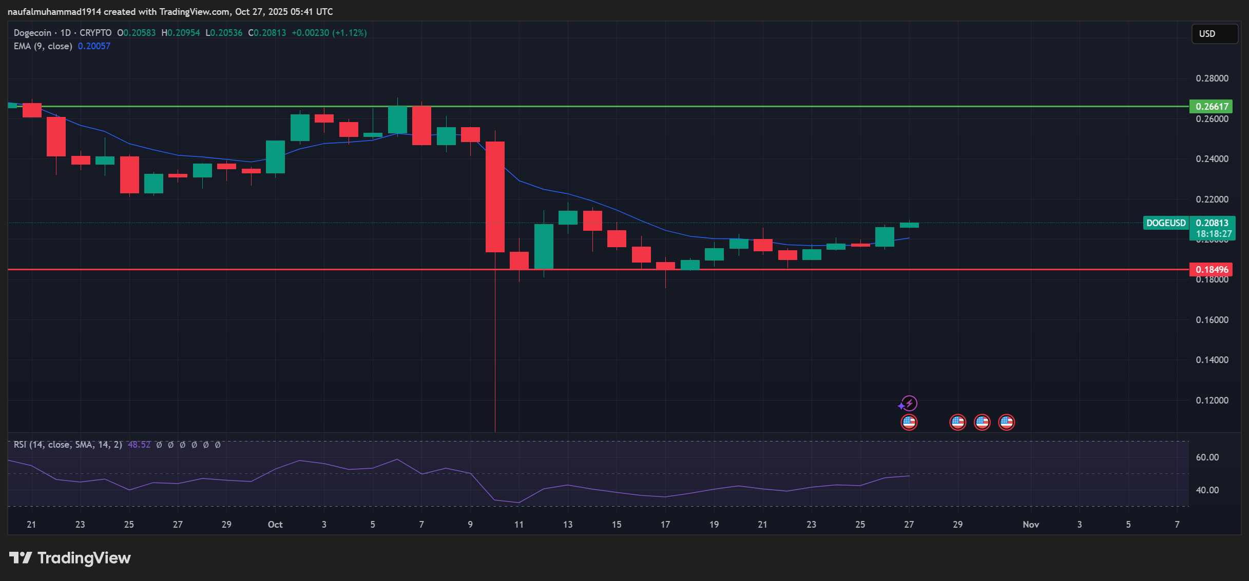 Jika DOGE sukses menembus area tersebut dan mempertahankannya, ruang kenaikan menuju $0.21 hingga $0.22 bisa terbuka.