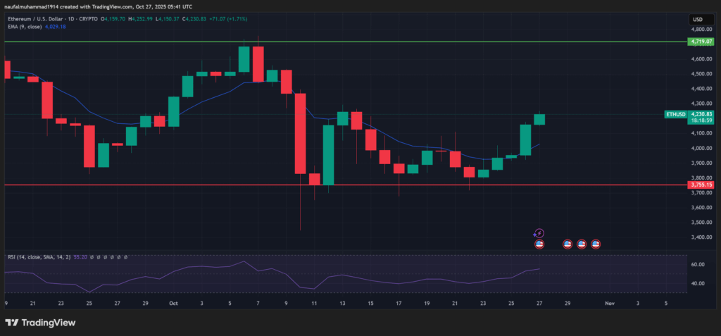 Ethereum mulai menunjukkan pemulihan stabil setelah sebelumnya bergerak di sekitar $3,850 dan sekarang memperkuat di atas $4,200. Pergerakan ini menandakan bahwa pembeli mulai menguasai pasar dan mendorong ETH keluar dari fase konsolidasi.
