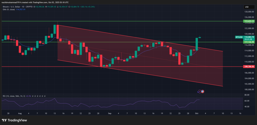 Di tengah krisis politik, pasar mata uang digital menunjukkan respons nan berbeda dibandingkan aset tradisional. Bitcoin mencatat apresiasi nilai signifikan, diperdagangkan di sekitar $118,900 setelah keluar dari area koreksi nan menahan pergerakan nilai sejak pertengahan September.