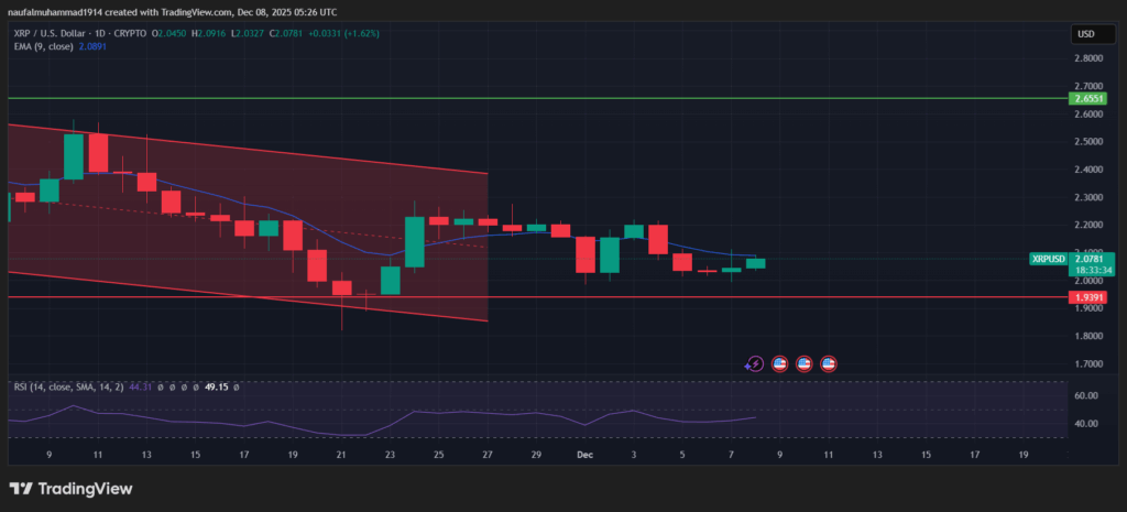 Pada saat tulisan ini ditulis, XRP sedang bergerak di sekitar $2.00, sebuah area psikologis sekaligus teknikal nan terus diuji selama beberapa hari terakhir.