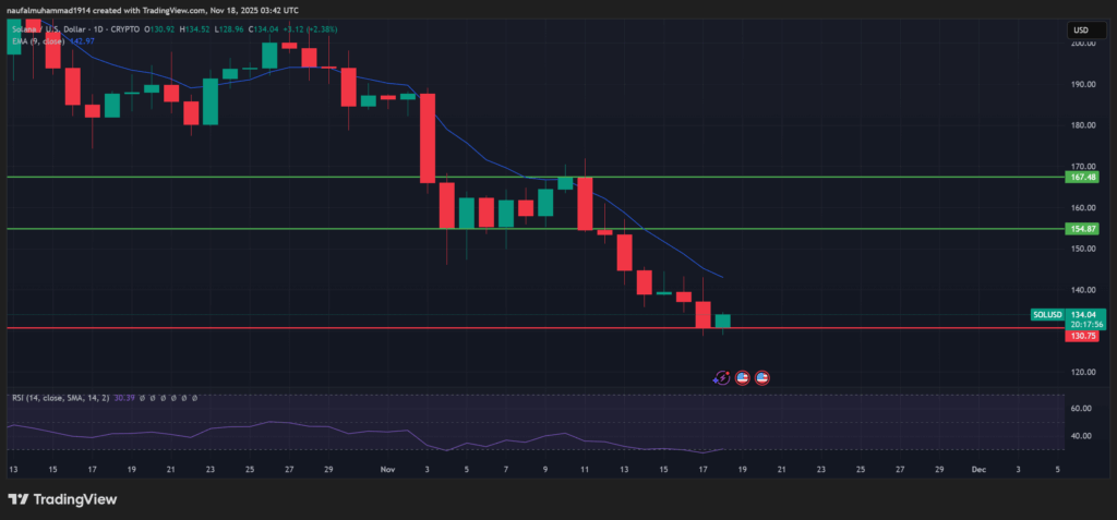 Pergerakan nilai SOL dalam beberapa minggu terakhir menggambarkan kondisi pasar nan sedang berada dalam tekanan kuat. Harga terus mengalami koreksi tanpa adanya dorongan kuat dari pembeli.