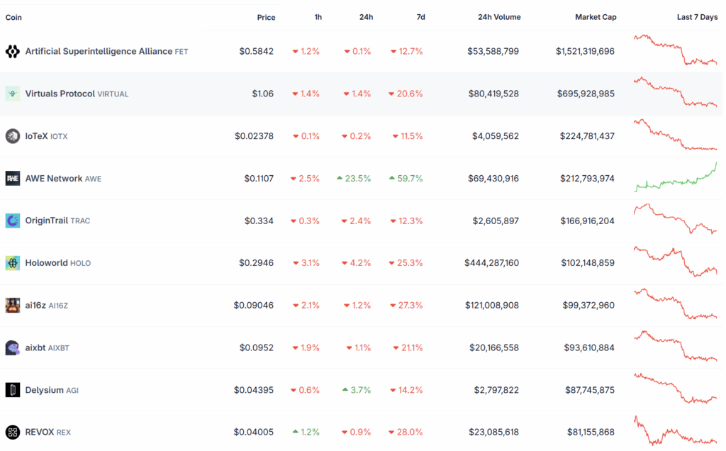 FET tetap menjadi pemimpin dengan kapitalisasi pasar lebih dari $1,52 miliar. Meski nilai turun 12,7% dalam tujuh hari, volume perdagangannya tetap tinggi.