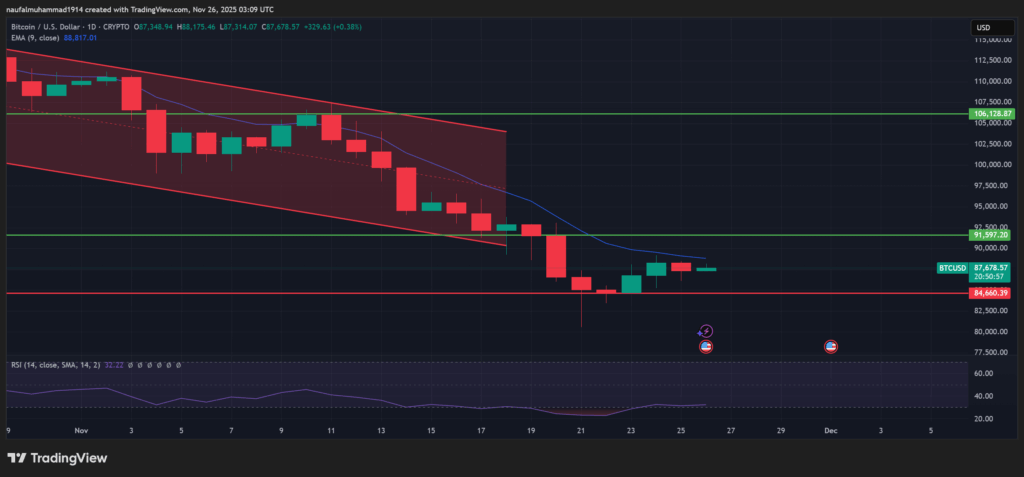 Secara teknikal, Bitcoin menunjukkan pola upaya pemulihan setelah menyentuh pemisah bawah di sekitar $84,660. Dari wilayah tersebut, BTC mulai bergerak naik menuju wilayah nilai berikutnya di sekitar $91,597.