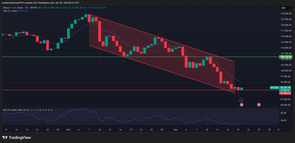 Bitcoin sempat menyentuh $91,500 setelah penurunan harian sekitar 5% dan dalam 30 hari terakhir mengalami penurunan sekitar 17%. Kondisi tersebut memperlihatkan tekanan besar dari sentimen makro nan sedang memburuk.