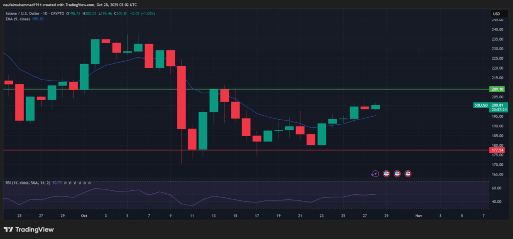 Secara teknikal, nilai Solana saat ini tetap bergerak dalam kisaran krusial antara pemisah bawah di sekitar $177 dan pemisah atas di sekitar $209. Batas atas ini menjadi area krusial untuk menilai kekuatan pergerakan berikutnya.